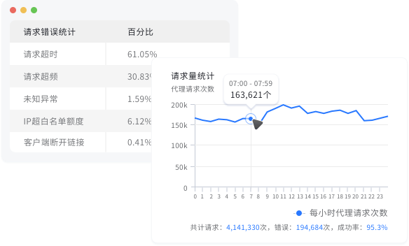 请求统计和错误统计分析,协助您优化采集策略、提升成功率 支持多维度图形和表单展示